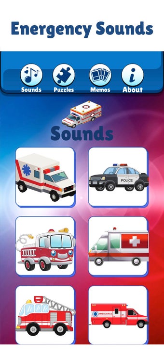 De app bevat hoogwaardige geluiden van hulpvoertuigen zoals een ambulance of politieauto. Dit is een leuke manier om uw kinderen te vermaken. Het is ontworpen voor jongere kinderen, geschikt voor jongere kinderen - raak het scherm aan om de geluiden van politieauto's, helikopters, ambulances of brandweerwagens af te spelen en match het met het juiste hulpvoertuig.